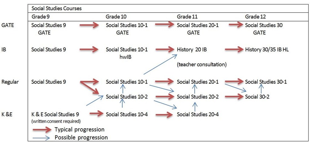 We offer -1 and -2 classes in all grades as well as K&E programming. Although these course streams follow the same curriculum, -1 classes require excellent attendance and a self-motivated student to achieve success. Competent writing skills and critical thinking will be areas of particular focus at all levels that students are well prepared for both the written response and multiple-choice diplomas. -2 courses are accepted for entrance to most post-secondary institutions. Written responses at this level focus on identifying essential curriculum and constructing an informed position on issues as well as recognizing viewpoints that differ from one’s own. This course offers a straightforward academic approach to Social Studies content.